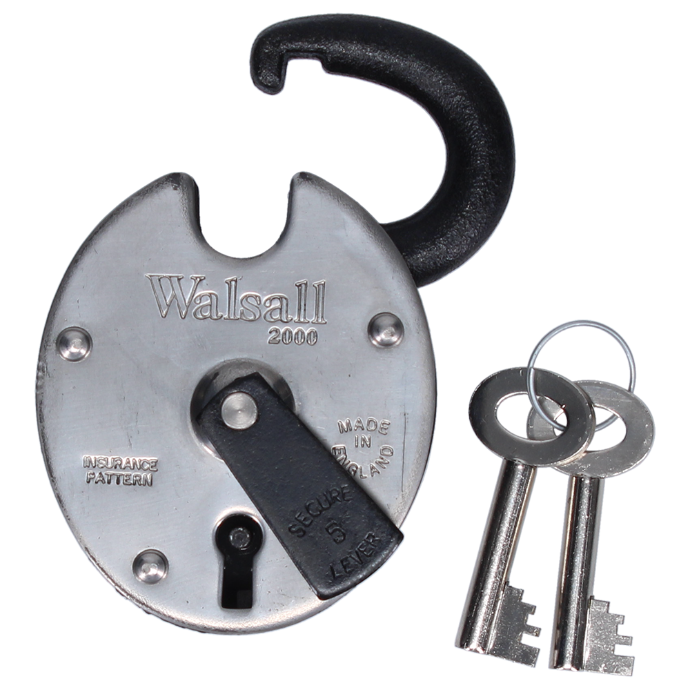The Walsall 2000 High Security 5 Lever Padlock has a stainless steel bolt and brass levers (both with anti-pick features), stainless steel outer body plates, a laminated steel rims rust-proofed with Sheraplex Black finish, a black chrome plated steel keyhole cover and a black chrome plated hardened steel shackle. It has 2,500 key combinations, complies with BS EN 12320:2012 (Padlock & Padlock Fittings - Security Grade 3), BS EN 1670:2007 (Building Hardware Corrosion Resistance - Grade 3 High) and is supplied complete with 2 keys.