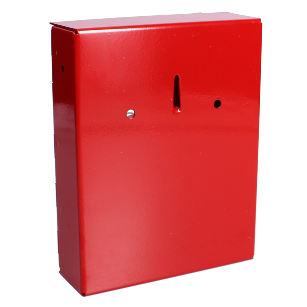 The Securikey EK1A Emergency Access Key Box is a compact, steel-constructed safety solution designed for storing a vital key in emergency situations. It features a high-visibility red powder-coated finish and a 2 mm break-glass front panel, allowing visual confirmation of the key's presence. The unit is supplied with a lockable camlock, two keys, a fixed key hook and screws suitable for wall fixing.