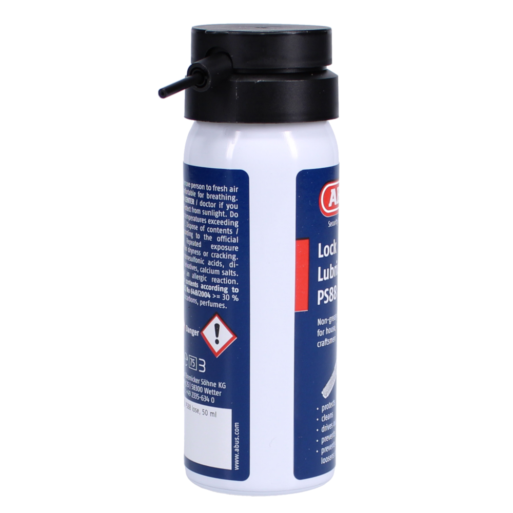 The ABUS PS88 Lubricant Spray is specially formulated to extend the life of locks. This versatile product is ideal for the protection and cleaning of keyholes, padlocks, car locks, tools, and various other applications. It drives out humidity and also prevents locks from icing up, ensuring they stay protected from harsh weather conditions all year round. The spray prevents corrosion, dust ingress and loosens sticky mechanisms.