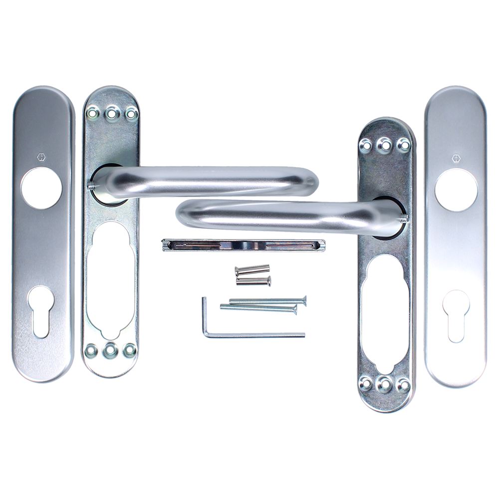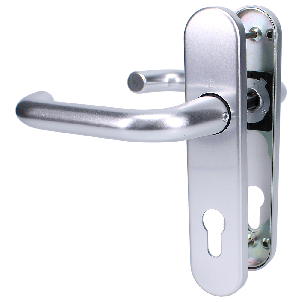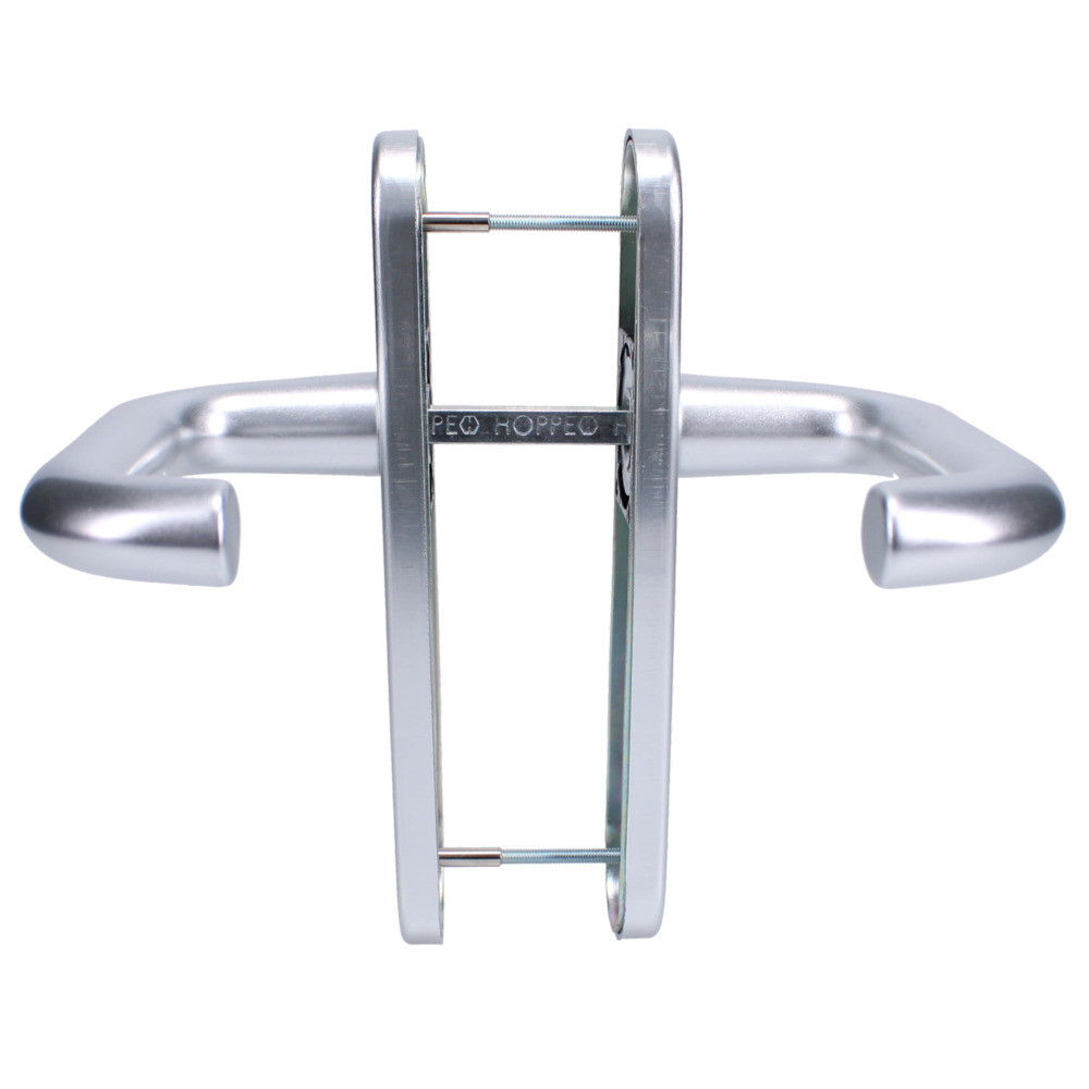 Hoppe aluminium handle set with 72mm keyhole distance on a short 194mm backplate. Suits internal doors 40mm - 50mm thick and has a euro profile cut-out.