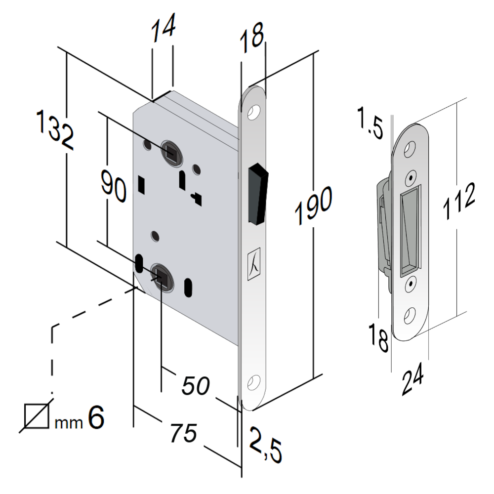 This package version includes the WC latch (Mod.341), an adjustable strike (Mod.GR9) and fitting screws.
