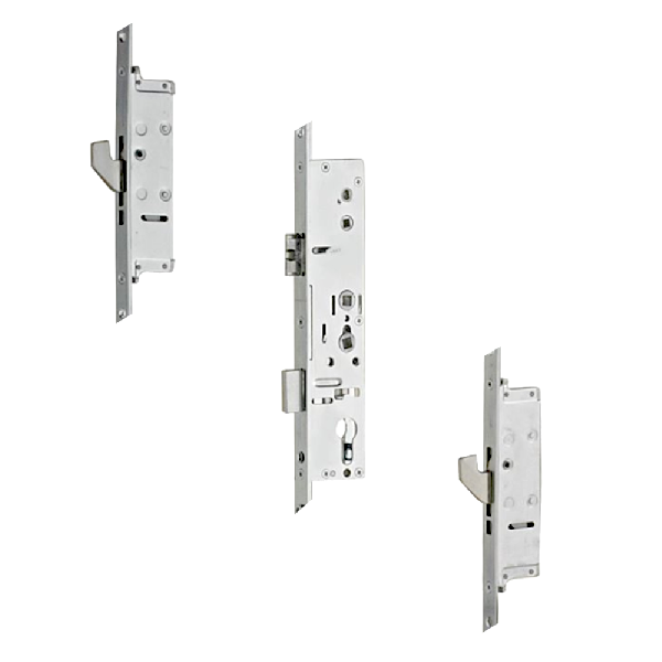 Lockmaster lever operated latch & deadbolt full multipoint lock unit with 2 hooks. It features a Euro profile centre case with a 20mm radius faceplate and twin spindle. The unit can be locked by using the lift lever to engage the locking mechanisms, after which a turn of the full cylinder locks it up. One full turn of the key followed by a push down on the lever unlocks the unit.