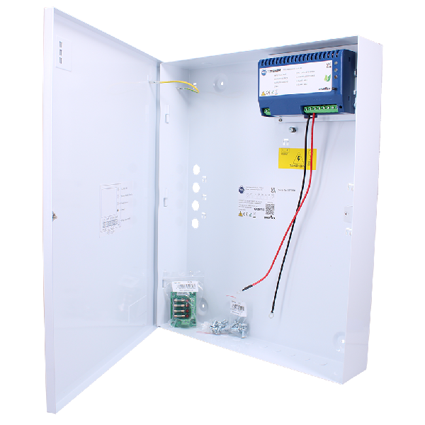 This boxed PSU is designed to fit four access control modules and comes with a 8 way fused output module (RL08) to allow individual fusing of boards.