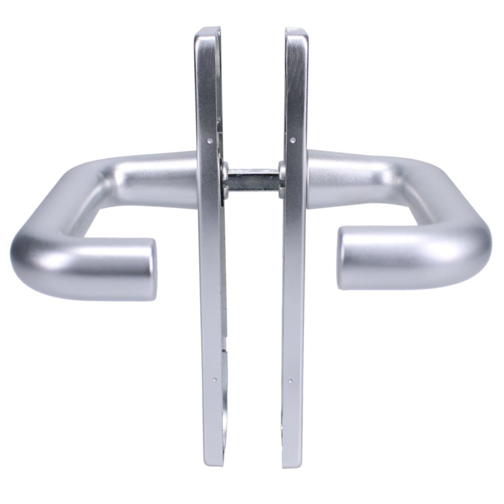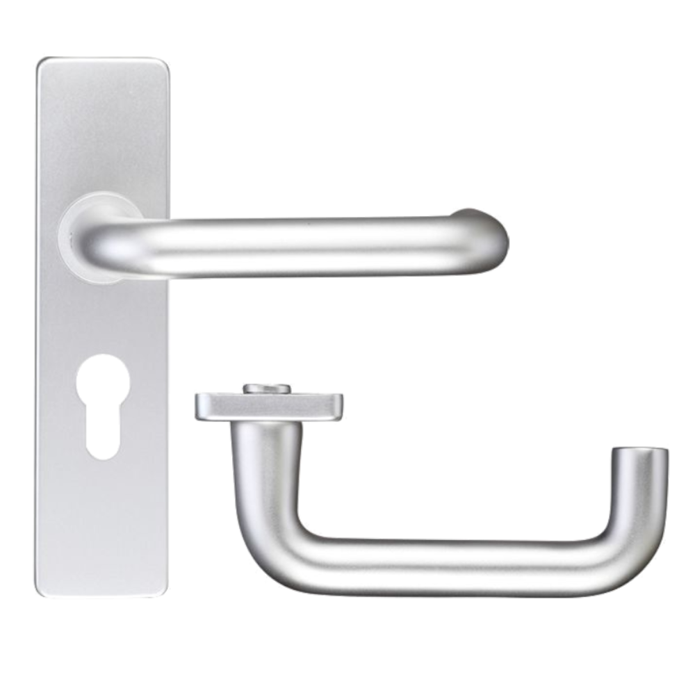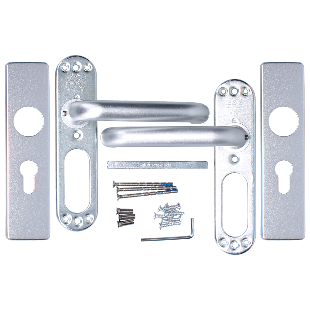 Zoo Architectural aluminium return to door lever backplate furniture to suit euro cylinder locks. Sold as a pair this contract handle set has a satin anodised aluminium finish and a 119mm long handle.